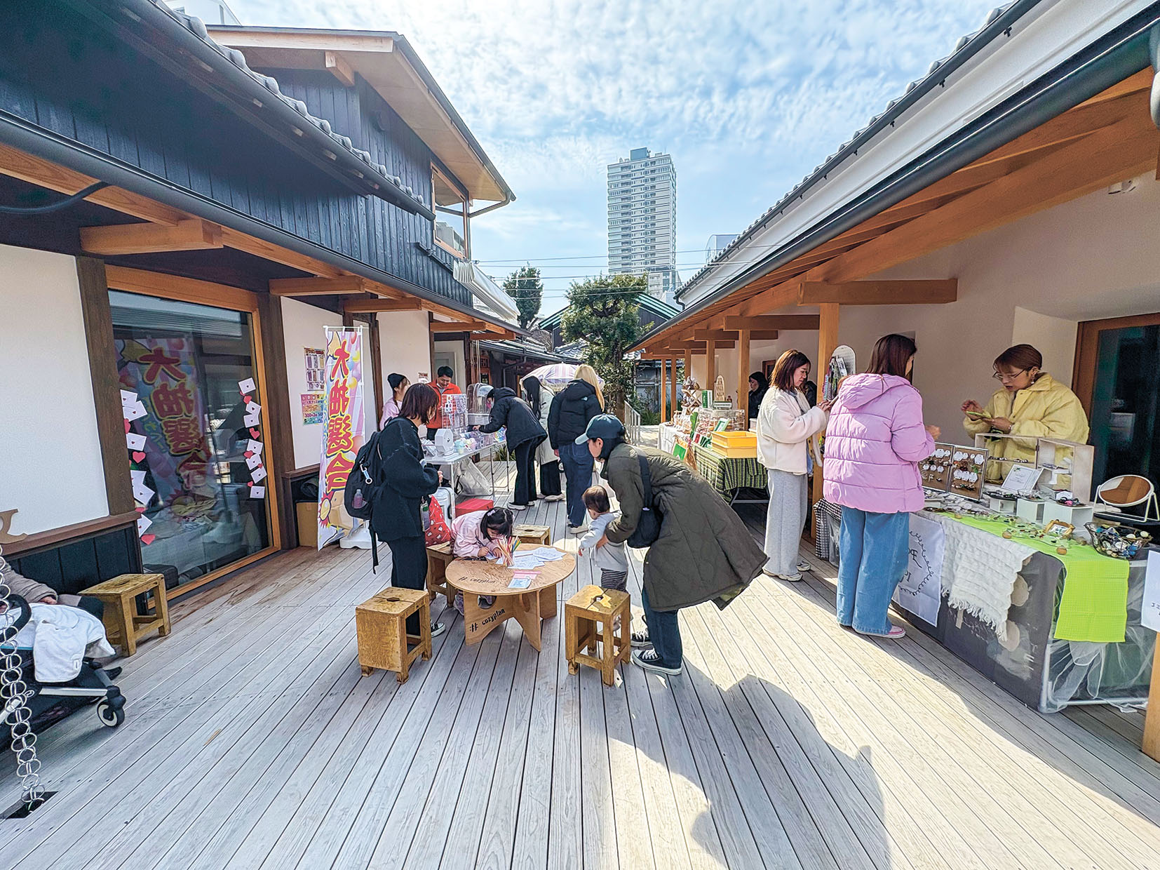 会場は1階から2階まで全館を貸し切り、パンや焼き菓子、ドーナツなどの飲食ブースをはじめ、ハンドメイドアクセサリー、耳ツボのワークショップ、子ども服、農産物など26店舗が出展。さらにボンボンドロップシールやおはじきシールの販売、フォトスポットも設けられた。当日は親子連れなど延べ320人が訪れ、思い思いの休日を楽しんだ。