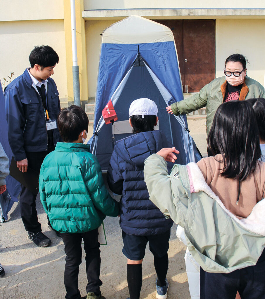 児童からは「学校が燃えているように見え、こわかった」「トイレは安心して使えることがわかった」などの声が上がった。このほか動画による災害クイズも行われ、児童らは楽しみながら防災への理解を深めた。(稲 砂登美)