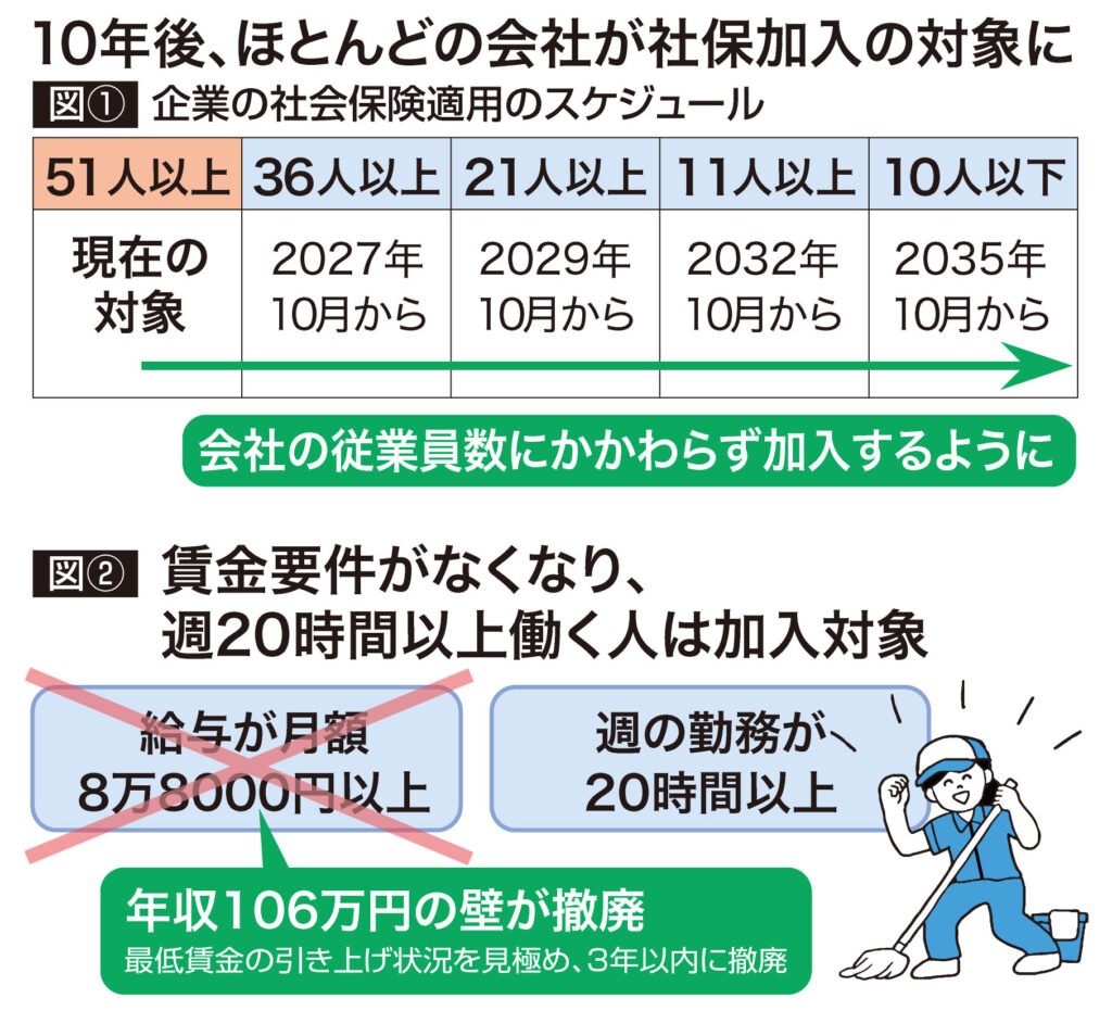 今回の改正では、さらに流れを進め、企業規模の条件を段階的に撤廃=図①。将来的には会社の人数に関係なく、一定の働き方をしていれば加入対象となる。「自分は対象外」と考えていた人も、今後は加入が必要になる可能性がある。
