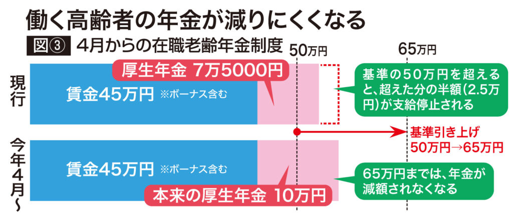 現在は、給与と年金の合計が月50万円を超えると、その超えた分の半分が支給停止される。改正では26年4月から、この基準額が月65万円に引き上げられる予定だ=図③。