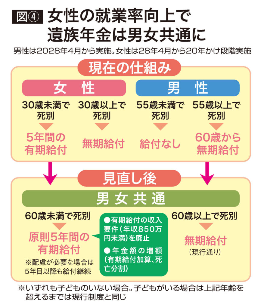 一つ目は、男女差の解消だ。これまで子どもがいない場合、夫を亡くした30歳以上の妻には原則として一生涯支給されていた。一方で、男性の受給条件は異なっていた。改正後は若い世代について、男女共通の仕組みとなり、原則5年間の有期給付となる=図④。