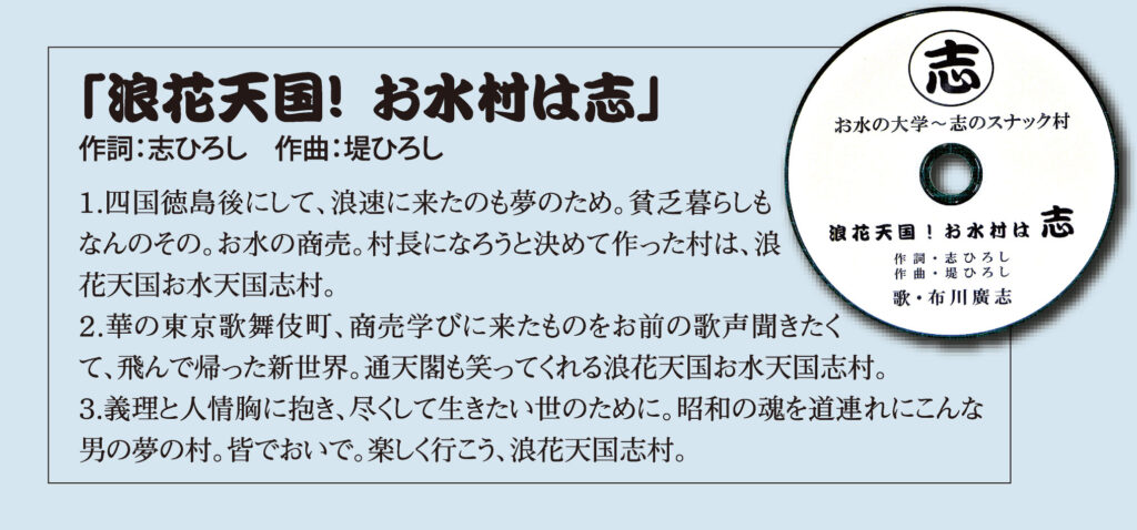 曲名は「浪花天国!お水村は志(こころざし)」。布川代表の半生をつづった歌詞を布川代表が名調子で〝布川節〟を披露しており。