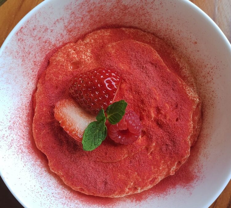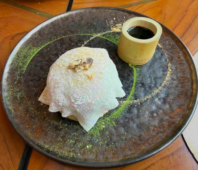 「ふわふわパンケーキ」ほうじ茶シャンティと求肥、黒蜜シロップの組み合わせ。ナイフを入れるとやわらかく沈み込み、口に入れるとふわふわ、しっとり、そして求肥のもっちり感。和のエッセンスが絶妙で、甘さも上品。
