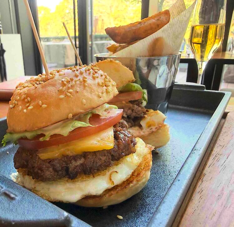 「ザ・ウィークエンドスマッシュバーガー」和牛パティの旨みがしっかり感じられ、シークレットソースと熟成チェダー、自家製ミルクバンのバランスが見事。フライドエッグのコクも加わり、満足感のある一品。