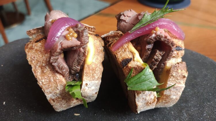 「ローストビーフと京都水菜のバゲットサンド」しっとりとしたローストビーフにオニオンピクルスとハニーマスタードがアクセントになっていて、重たくなりすぎない。