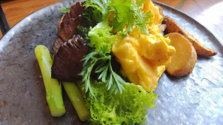 「ステーキ&エッグ」ドライエイジ和牛の旨みがしっかり。グリルアスパラガスとサルサヴェルデが爽やかさを添えていて、ブランチでこんな贅沢をしていいのかなと思うほど。