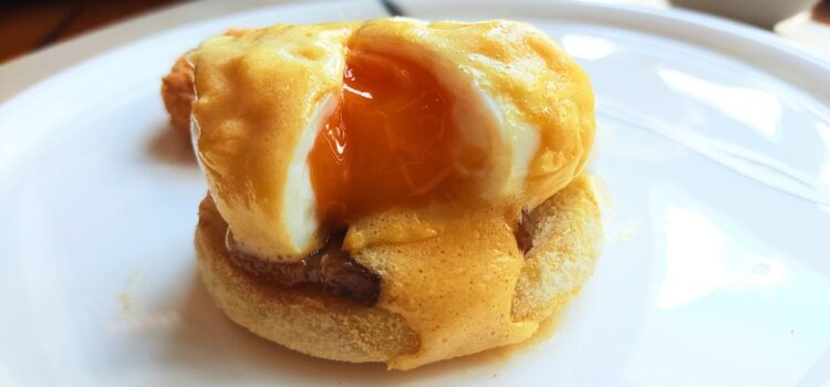 そして、もう一品おすすめなのがEMBAベネディクト。ちょうど良い感じの半熟卵状態のポーチドエッグは半分に切ると濃厚な黄身がトロッと流れ出てきて食欲をそそられる。