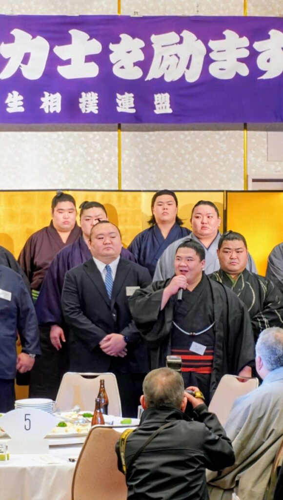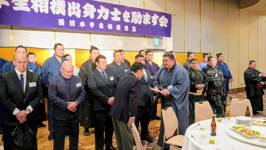 主催者を代表して、西日本学生相撲連盟の西野勉会長が「今場所はウクライナから来日し関西大でけいこして力を付けた大関安青錦の綱取りは話題です。学生出身力士も頑張ってくれて春場所新番付では横綱大の里(日体大)はじめ、今や十両以上全関取の半数超が学生相撲のOBや経験者の時代です」と激励。