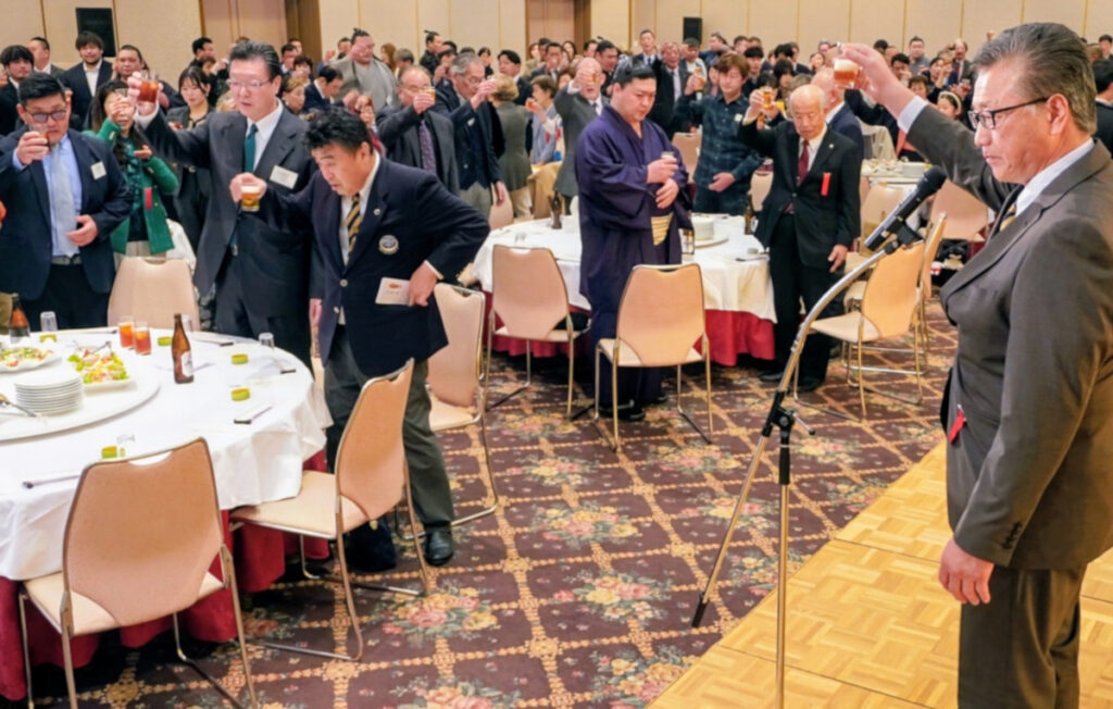 大相撲春場所(3月8日初日)前の恒例イベント「学生出身力士を励ます会」が大阪市天王寺区のホテルで開かれ、大学相撲部OBで近畿大出身の宮城野親方(元横綱旭富士)、同志社大出身の立川親方(元関脇土佐ノ海)ら協会年寄7人をはじめ、学生出身現役力士134人のうち地元ゆかりの近畿大出身で元大関の前頭朝乃山(近大-高砂)や大阪府四條畷市出身で兄弟関取の前頭朝紅龍(日体大-高砂)と十両朝翠龍(同)ら計17人が出席。一般参加者含め約200人で歓談した。