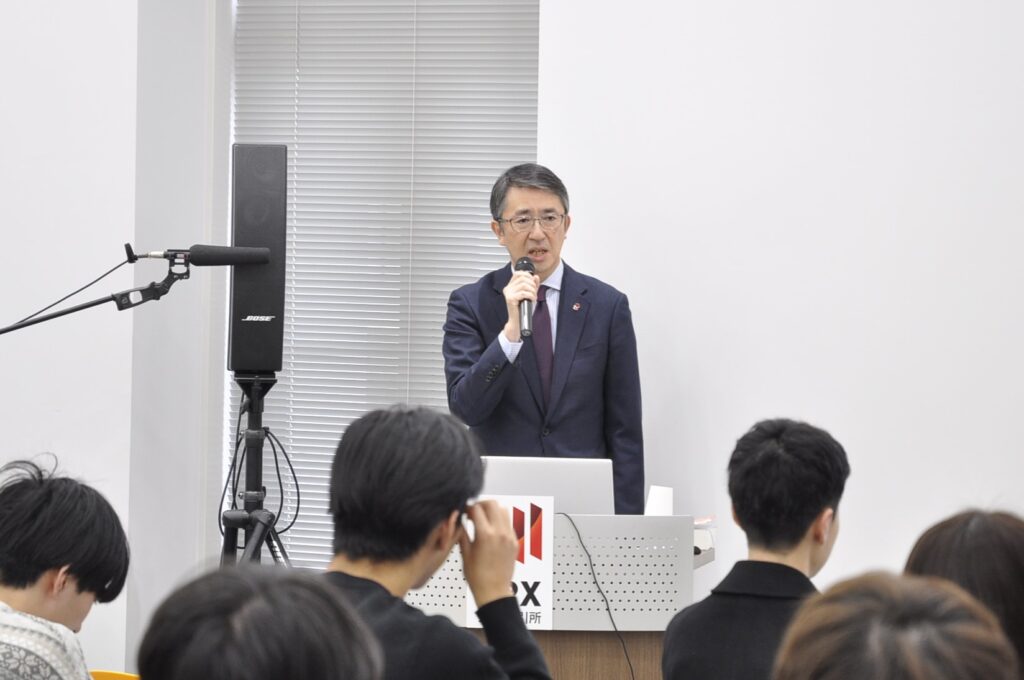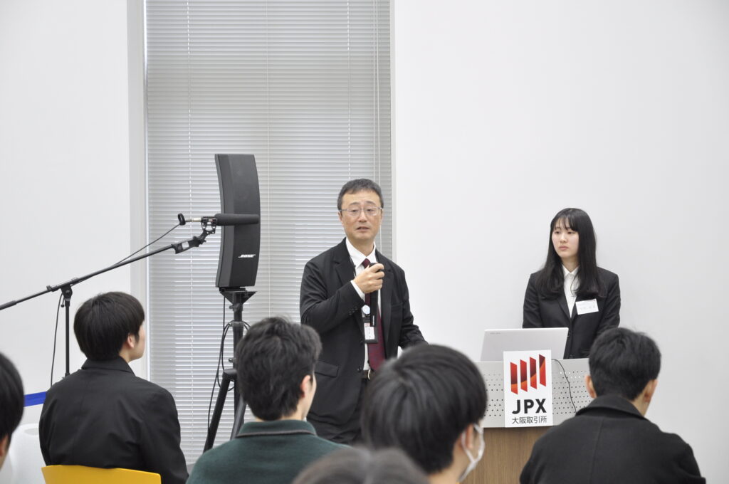 冒頭、大阪取引所の金融教育を担う金融リテラシーサポート部の西小路俊之氏があいさつ。大阪株式取引所から数えて約150年の歴史があることや、現在の建物は約20年前に改装されたことを紹介し、「金融知識を高める取り組みを続けたい」と述べた。