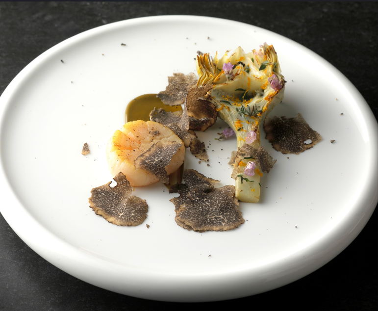 〝美食の黒いダイヤモンド〟と称されるペリゴールトリュフは、世界的にも希少性が高く、土やヘーゼルナッツ、きのこを思わせる奥深く濃厚な香りが特徴。牡丹海老や北海道産帆立、和牛テンダーロインなどを取り入れ、シェフの繊細な技で素材の持ち味を引き出す。