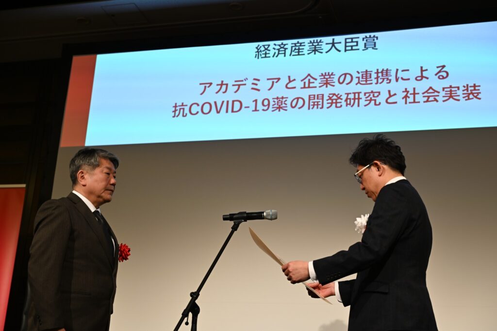 塩野義製薬(大阪市北区)と北海道大学(札幌市北区)が共同で進めてきた新型コロナウイルス感染症(COVID―19)治療薬の研究が評価され、内閣府主催の「第8回日本オープンイノベーション大賞」で経済産業大臣賞を受賞した。表彰式は2月9日、東京都港区の虎ノ門ヒルズフォーラムで行われた。