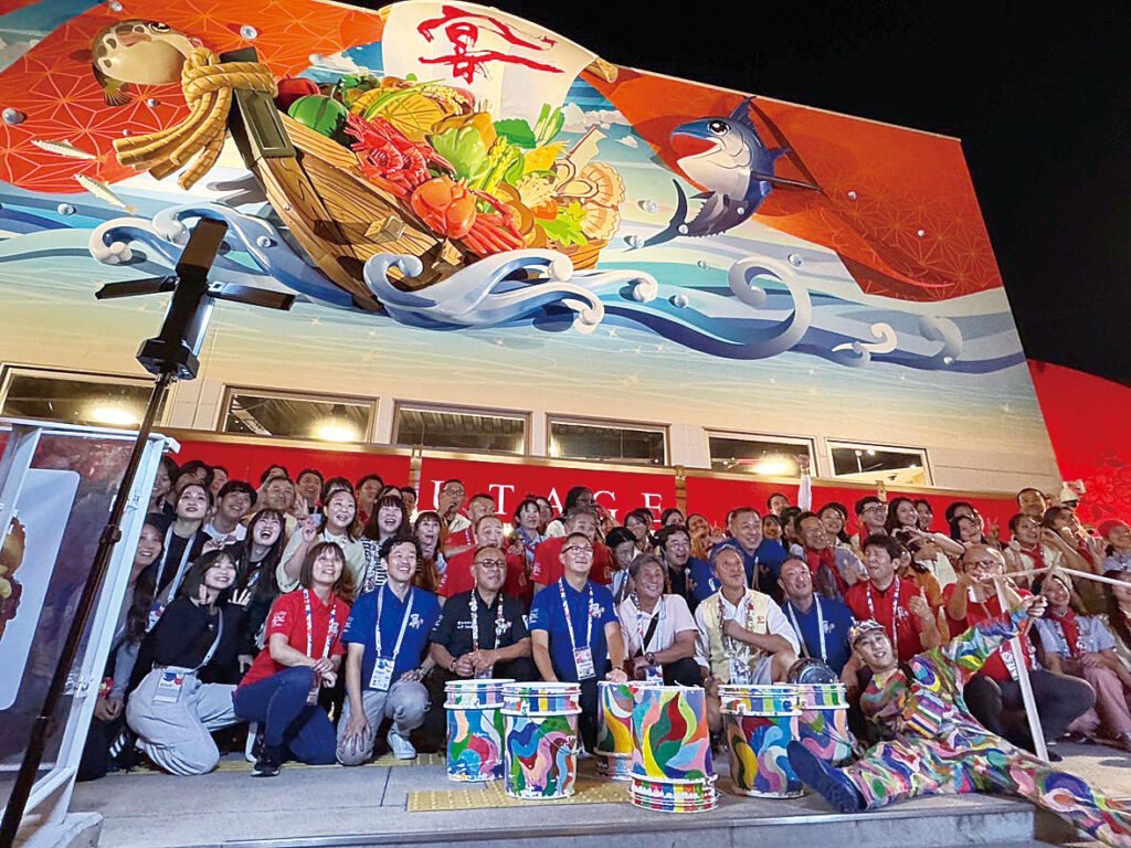 万博閉幕日の10月13日、外食パビリオン「宴」の前で成功を喜ぶ関係者ら=(一社)大阪外食産業協会提供