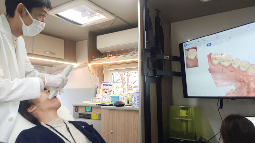 検診会場は車内の〝動く診察室〟。受診者は3Dスキャナーで歯や口の中を撮影し、その場で具体的な助言を受けた。矯正用のマウスピースや歯周病の予防薬などは、必要に応じてその場で注文できる仕組みも用意された。