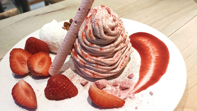 見た目にも華やかな一品で、皿にはカットしたいちごやいちごジャムが散りばめられ、彩り豊かに盛り付けられている。中央にはいちごのモンブランクリームが据えられ、その中にはフランボワーズ風味のシロップを染み込ませたスポンジケーキといちごが隠れている。