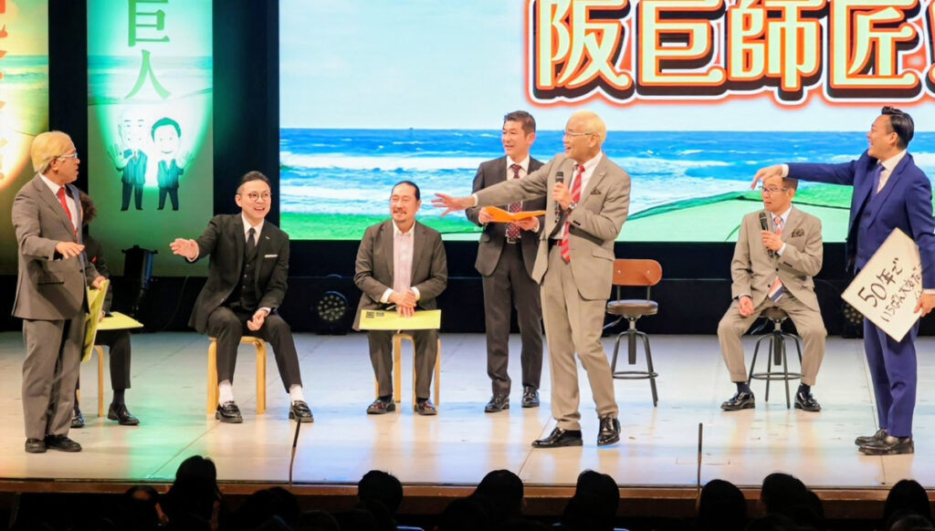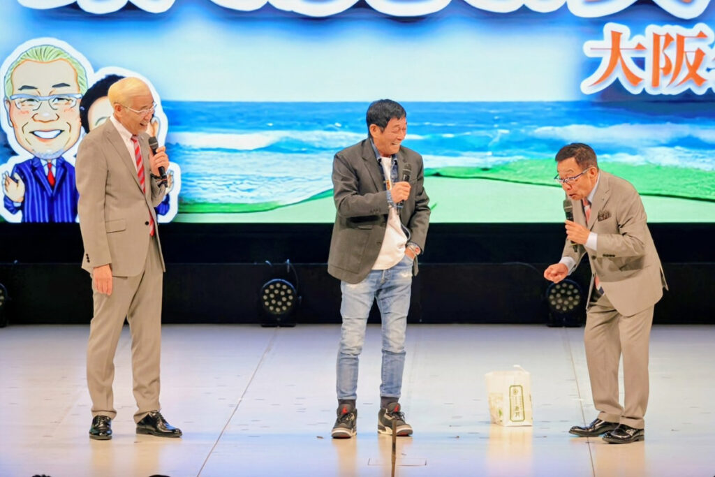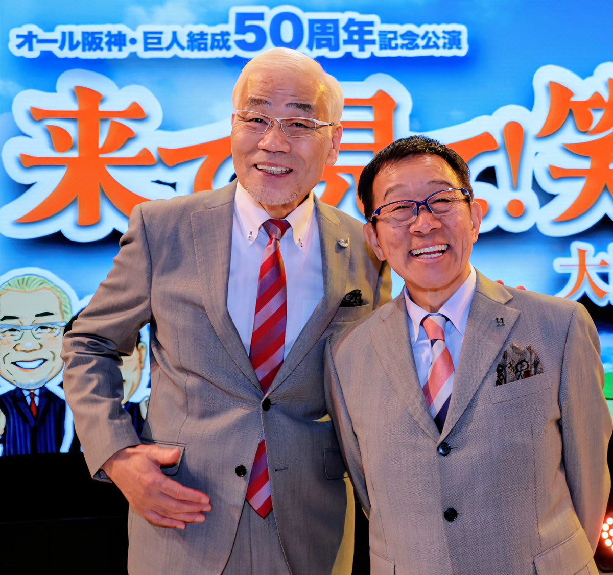 第一次石油ショックも覚めやらぬ1975年にコンビ結成。共にテレビ・ラジオの素人参加番組常連で、NSC(吉本総合芸能学院)など芸能スクールが無い時代のルールで既存芸人の弟子になる必要があり吉本新喜劇の大スター・岡八郎に入門し芸能活動スタート。共に落語家の別名を持ち、巨人は歌唱、阪神は釣りと趣味を生かした活動も行ってきた。50周年ツアーは、昨年7月の宮崎を最初に、大阪、鹿児島、東京と巡り、再び大阪で千秋楽。この日コンビでは漫才2本を披露、昔のネタやアドリブも取り入れダイナミックに展開。東京公演に続き〝巨人は同期〟と公言するさんまがサプライズ登場。2人が尿漏れ防止パンツや持病の話題をすると、すかさずさんまが「暗い話すな!」と一喝し息もピッタリ。