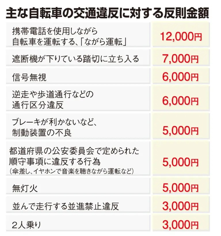 最大のポイントは、自転車に対する「青切符」の導入だ。16歳以上の運転者を対象に、信号無視や一時不停止などの交通違反を行った場合、反則金の支払いを求める「交通反則通告制度(青切符)」が適用される。従来は指導警告や、刑事処分の対象となる「赤切符」が中心だったが、今後はより簡易かつ迅速に責任を問う仕組みへと移行する。各違反に対する反則金額も定められている。