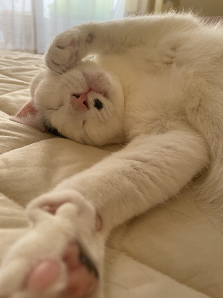 深夜や早朝にドタドタと走り回り、こちらの顔をツンツンして起こしてくるくせに、私が働いている間は何事もなかったようにスヤスヤ。気持ち良さそうに昼寝を決め込む、むちむちのわがままボディちゃん。