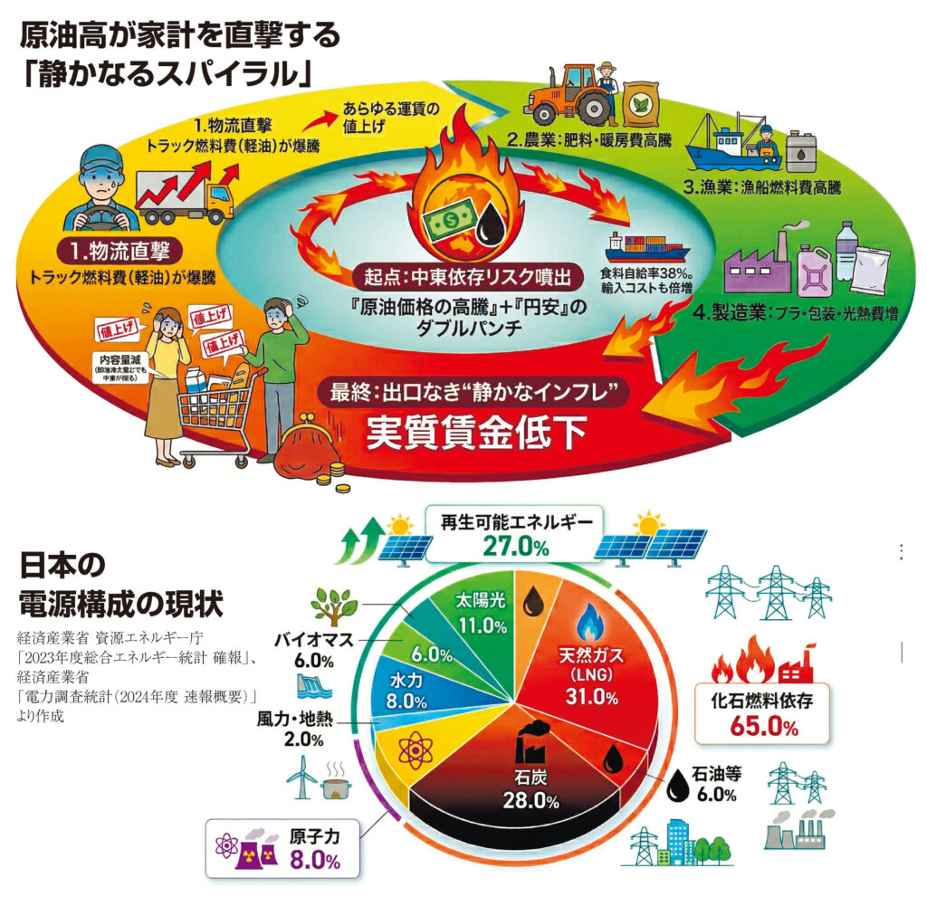 では代替はあるのか。ない。これが現実だ。日本の発電の65%は火力。その中心であるLNGは中東依存こそ低いが、価格は原油と連動する。結局同じ運命をたどる。米国からの輸入拡大? インフラも成分調整も追いつかず、即効性はゼロだ。