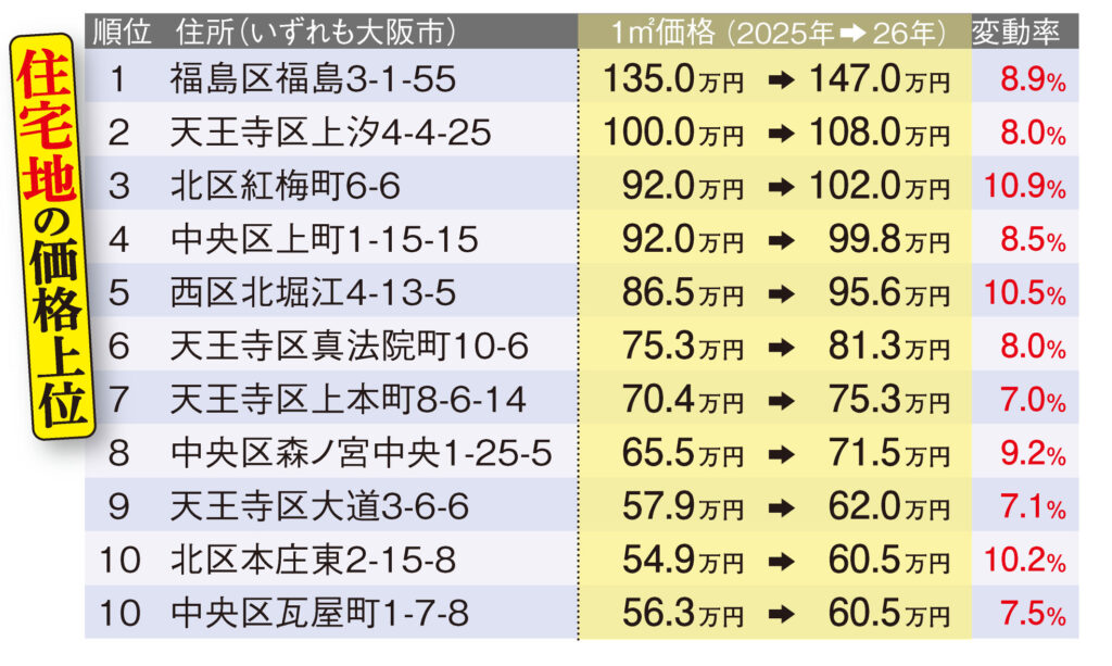 住宅地上昇率の1、2位は大阪市の北区紅梅町と浪速区桜川(いずれも10.9%)となったが、3位に城東区中央(10.9%)、7位に都島区中野町(9.8%)、8〜10位は淀川区と東淀川区が占めるなど、都心に近い居住エリアが極めて高い伸びを見せている。