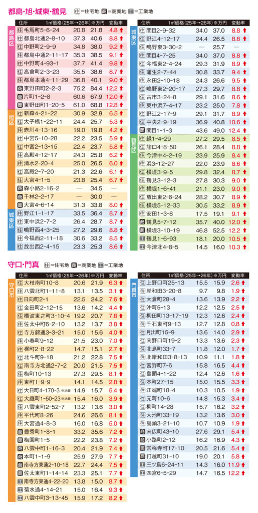 高騰する大阪都心部の住宅地上昇は大阪市外にも波及。大阪市を除いた府平均は上昇率2.0%の中、北大阪地域の吹田、豊中、茨木、高槻、摂津、箕面がいずれも2.9%以上の上昇。京阪沿線では守口が5.4%、寝屋川(2.6%)、門真(2.4%)も府平均を上回った。泉州地域でも堺市が3.9%と利便性の高い周辺地域の上昇が顕著だ。