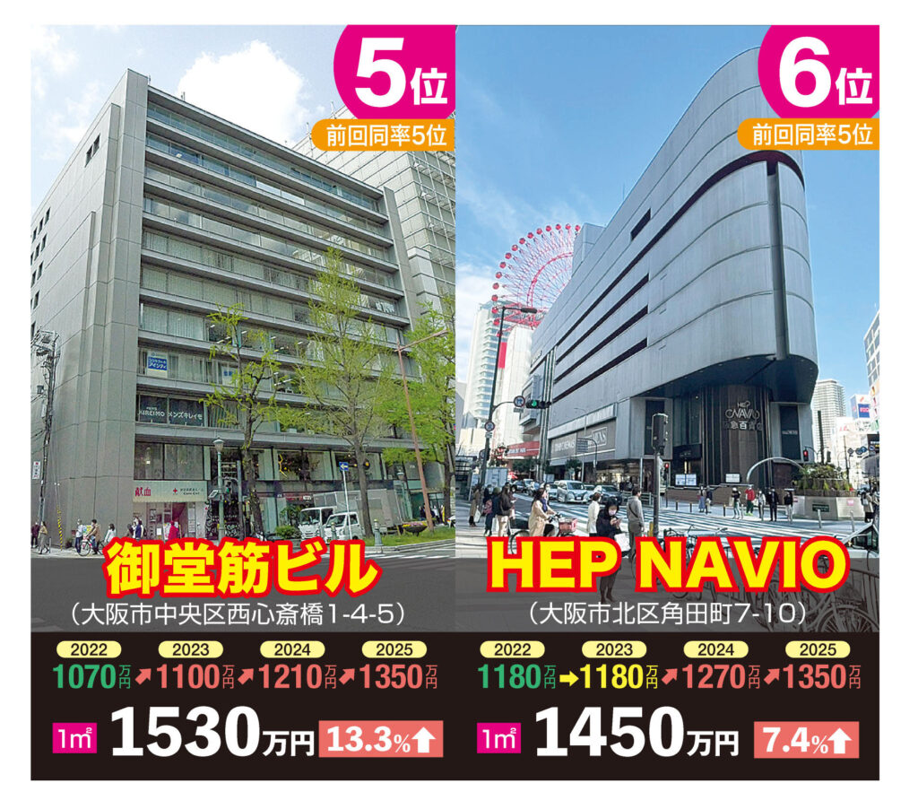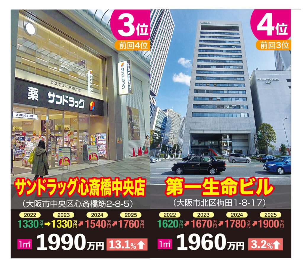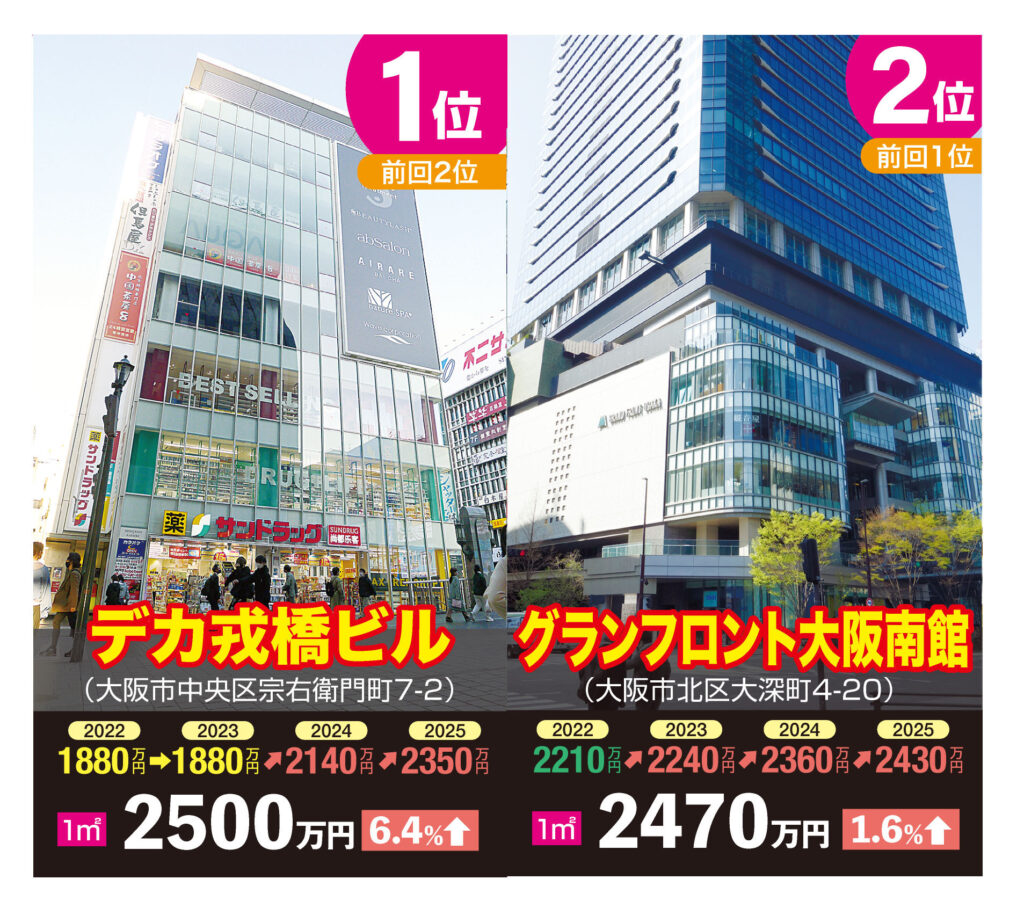 商業地の府内最高価格地点は大きく順位変動が起きた。道頓堀の戎橋そばにある「デカ戎橋ビル」が1平方㍍あたり2500万円を付け、キタの「グランフロント大阪南館」を抑えて6年ぶりに1位に返り咲いた。