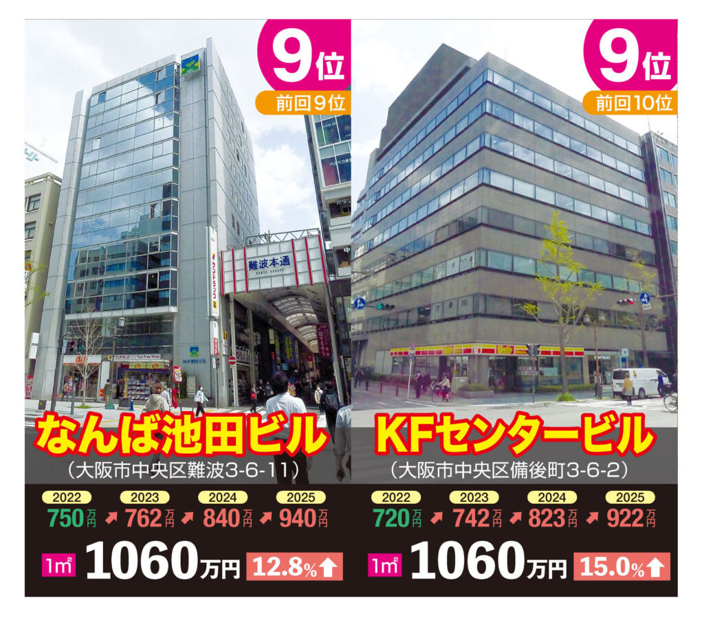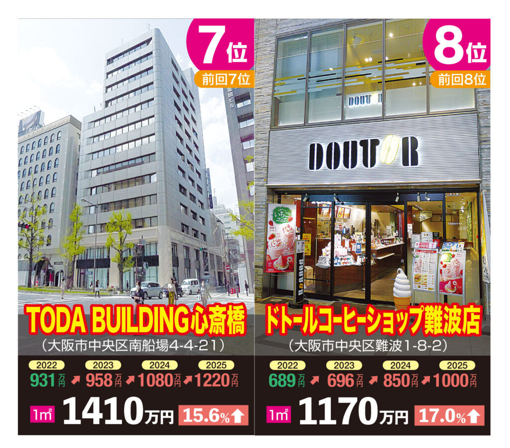 2021年からグランフロント大阪南館が首位を維持してきたが、コロナ禍明けの旺盛なインバウンド需要と店舗需要の回復で、再びミナミがトップの座を奪い返した形だ。大阪市区別の上昇率でもミナミの中央区と浪速区が共に15.5%(市平均12.7%)でトップ。また、道頓堀の「新世界串カツいっとく道頓堀戎橋店」の地点が全国の商業地上昇率でも8位(25%)になるなど、ミナミの勢いが鮮明になっている。