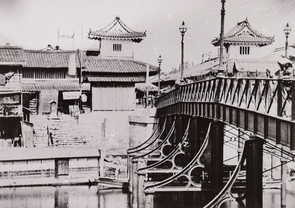 明治3(1870)年、高麗橋は鉄橋に架け替えられた。当時の大阪府知事、後藤象二郎が木橋より水害に強い鉄橋の利点に着目し、事業を進めた。しかし、日本の技術だけでは難しく、英国のオールト社に発注。ところが、どう寸法を違えたのか、橋の長さが川幅に足りず、橋台を川に突き出すように築いて何とか間に合わせたという。契約を巡る金銭トラブルも重なり、外交問題に発展したとの話も残る。