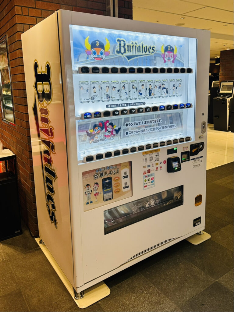 ロビーには球団デザインの自動販売機も設置され、選手ステッカー付きのレモンスカッシュを販売。ファン心をくすぐる空間となっている。
