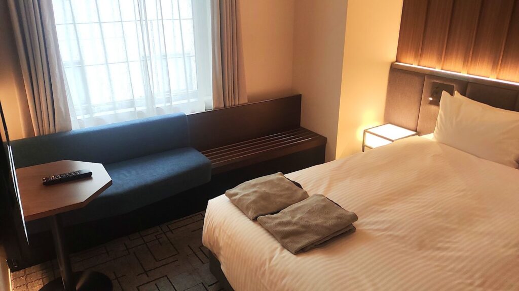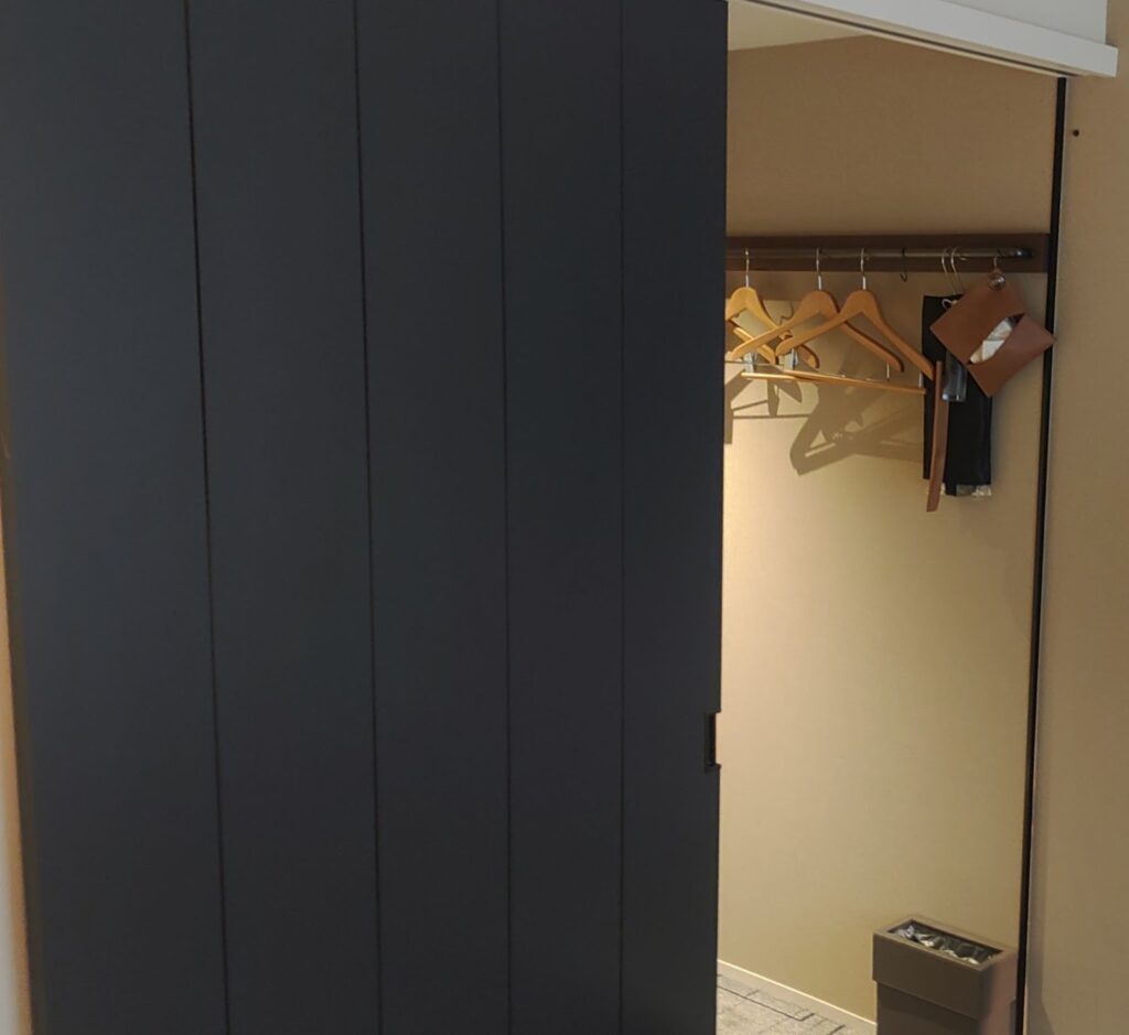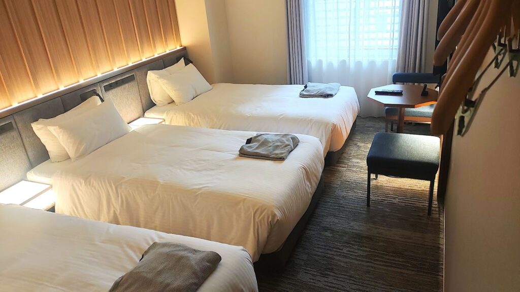 各部屋はハイクラスのビジネスホテルのような設えで、ベッドとテーブルやチェア、テレビなどがあり、寝室部分とバストイレ部分を仕切るスライドドアがあり、複数で滞在した際のプライバシーに配慮された作りになっている。