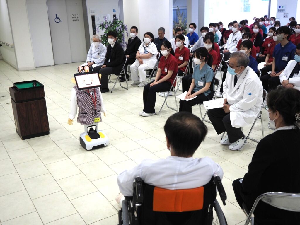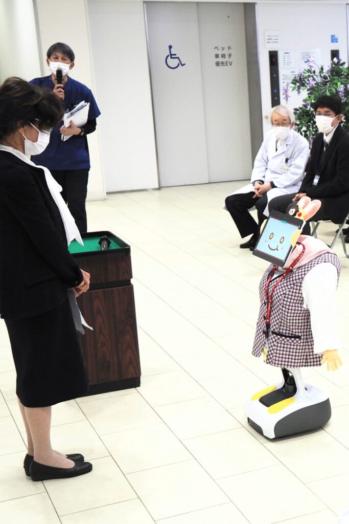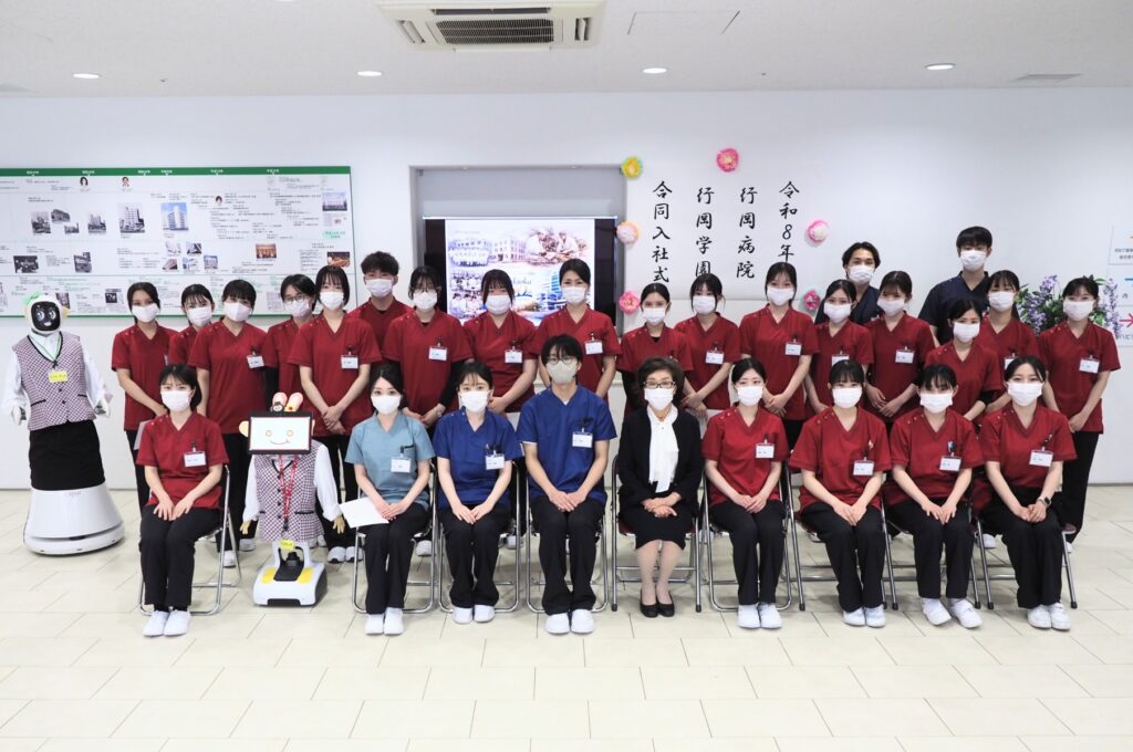 同院によると、新入社員の内訳は、看護師23人、医技師(医療技術職)7人、案内ロボット「テミちゃん」1体の計31人。新棟1階ロビーで開かれた式では、「テミちゃん」も新入社員の一員として参加し、関係者の注目を集めた。