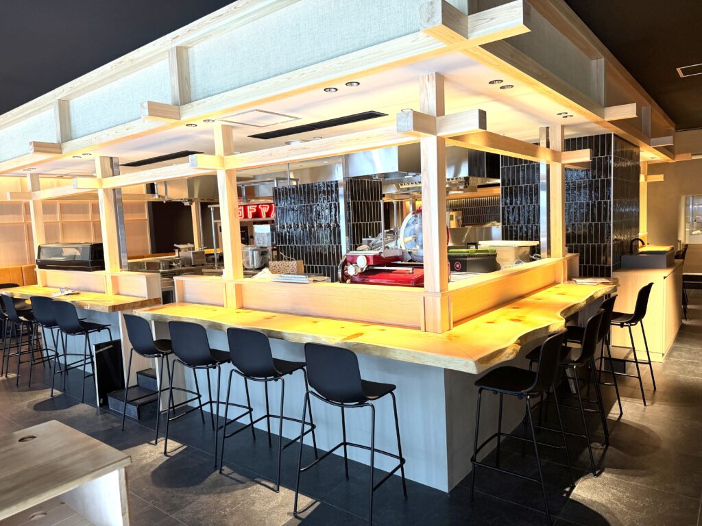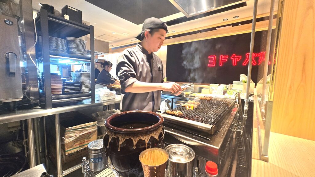 そんな同館の1階に誕生したのがヨドヤバ。ネーミングもインパクト満点だが、同施設の特徴は何といっても、テナントの垣根を越えて飲食できる点だ。フロア内には串カツ「揚八」、焼き鳥「とり五楼」、イタリアン「BAKKANO」、海鮮居酒屋「しらすくじら」の4店舗が並ぶが、どの店の料理も一緒に、テーブルのQRコードを読みこめばスマホ操作で簡単に注文できるのがありがたい。いわば〝フードホールのいいとこ取り〟なのだが、オーダーしたメニューは席まで運んでくれるフルサービス型だから、取りに行く手間もない。呼び出しベルに気を取られることなく、ゆったりと会話や食事に集中できるのも嬉しい。席種も豊富で、中央に配されたオープンキッチンを囲むカウンター席では、串を焼く炎や牡蠣をさばく手元を間近に見ながら食事が楽しめる。テーブル席や通りを望むテラス席もあり、一人での昼飲みから、友人や同僚とのディナーまで幅広く利用できる。