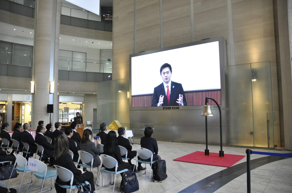 セレモニーの第一部では、代表取締役社長の多賀谷彰氏が新商品を紹介。続いて吉村洋文・大阪府知事と横山英幸・大阪市長からのビデオメッセージが上映され、日本商品先物振興協会会長の釼持宏昭氏による打鐘と、大阪の伝統的な手締め「大株締め(だいかぶじめ)」で上場を祝った。