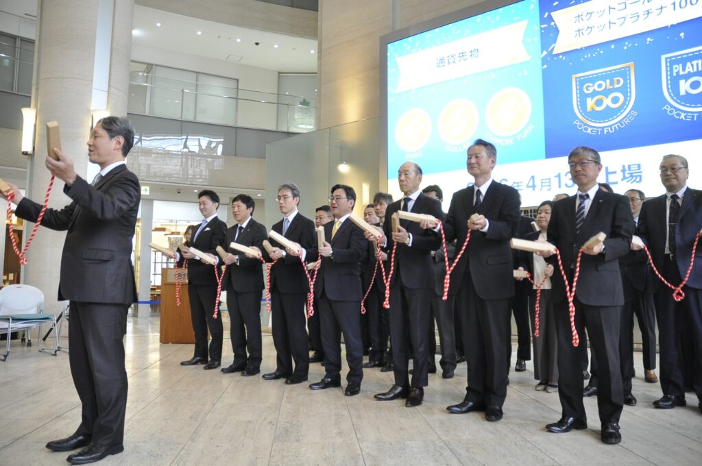 通貨先物と小口の貴金属先物「ポケットゴールド100先物」「ポケットプラチナ100先物」の上場セレモニーが4月13日、大阪市中央区北浜の大阪取引所1階アトリウムで開かれた。市場関係者らが出席し、新商品の船出を祝った。