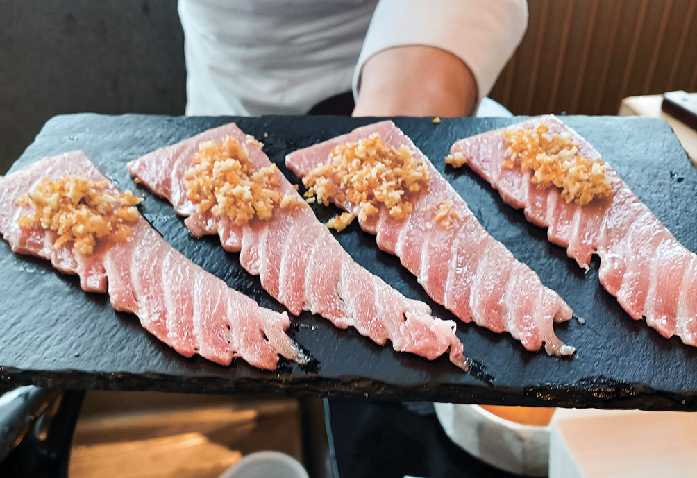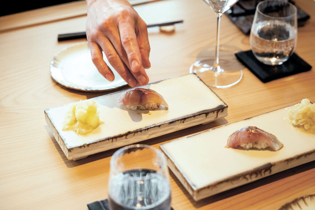 続くにぎりを担うのは、名門「八芳園」や海外でヘッドシェフを歴任した安田至氏だ。アレノ氏がその卓越した技術に全幅の信頼を寄せる安田氏は、檜のカウンターで一貫ごとに仕上げるスタイルを貫く。江戸前鮨の真髄である〝一手間〟かけた一貫が丁寧ににぎられる。提供直前に柑橘を搾る、削りたての鰹節を添えるなど、細やかな工夫を重ねる。備長炭で炙る際の香りや音も、五感を刺激する演出として印象的だ。圧巻は、取り出された見事なマグロの柵に目の前で包丁が入れられる瞬間だ。断面は、霜降り肉のように鮮やかでゲストを魅了する。