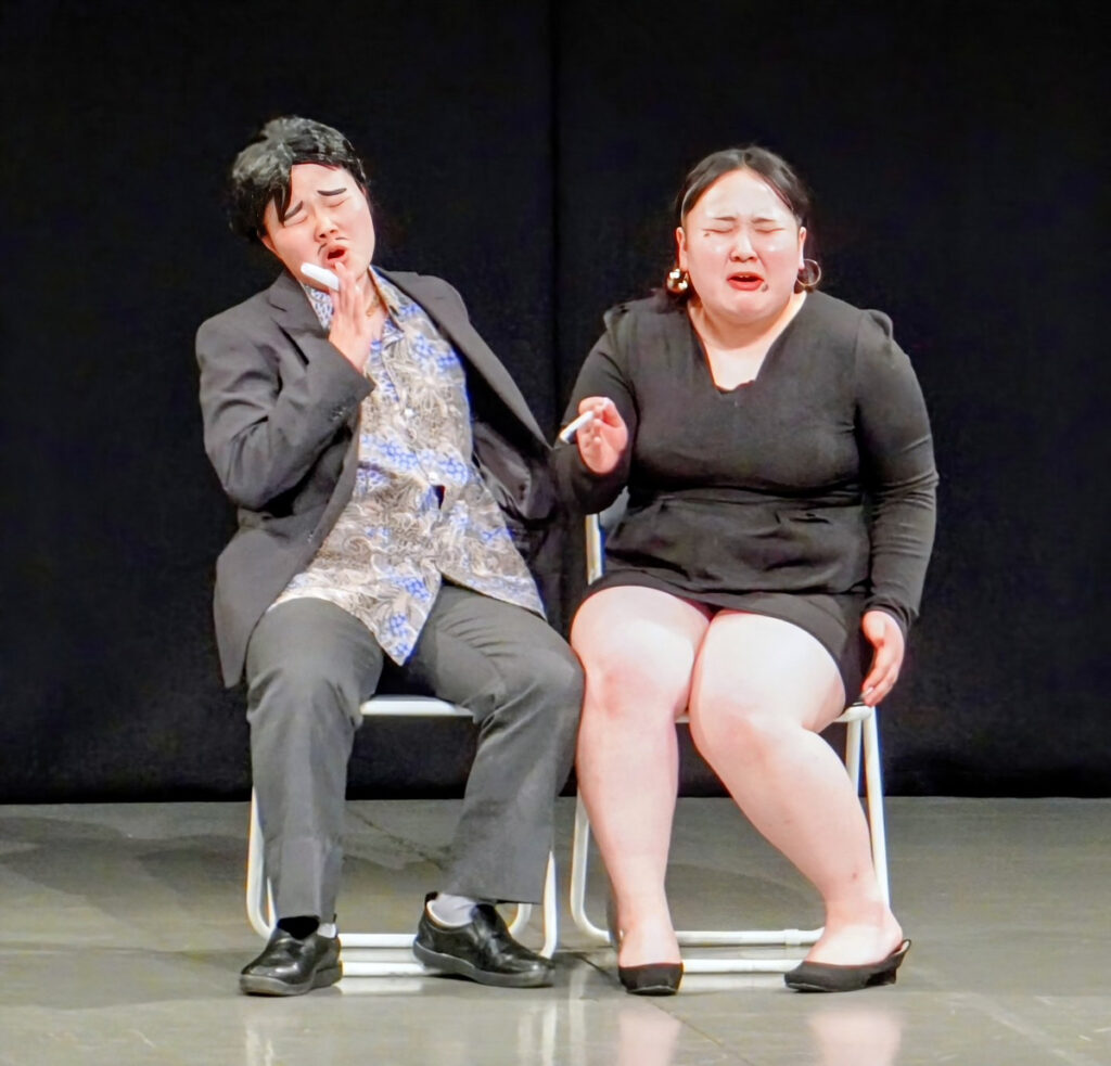 12組全部がコンビ芸で9組が漫才、3組がコント。9番目に登場した「国背負い」はこけ若(21)がやくざ、池田てんこ盛り(19)がその愛人にふんし〝追われて逃げるアウトローなカップル〟のコントを熱演。軽妙なやりとりから、最期はハリウッド映画「俺たちに明日はない」のボニーとクライドばりに機関銃弾に倒れる2人をコミカルに演じ会場を爆笑の渦に巻き込んだ。
