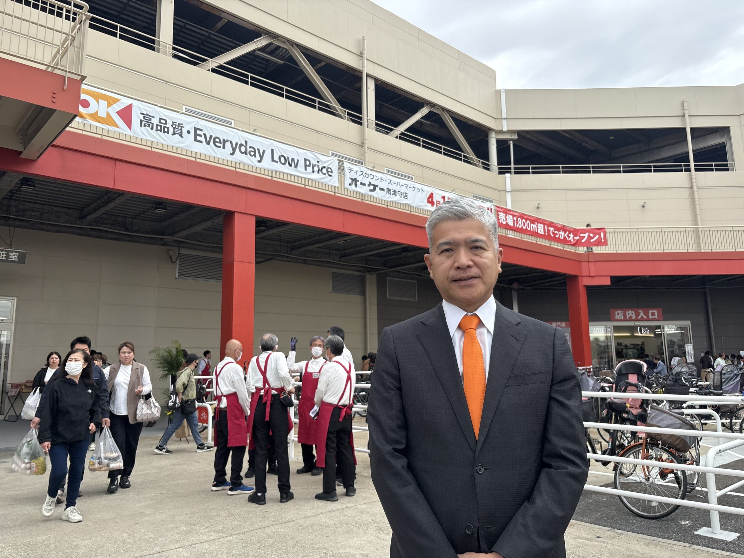 南津守店のオープンに駆けつけた二宮涼太郎社長=4月15日、オーケー南津守店(編集部撮影)