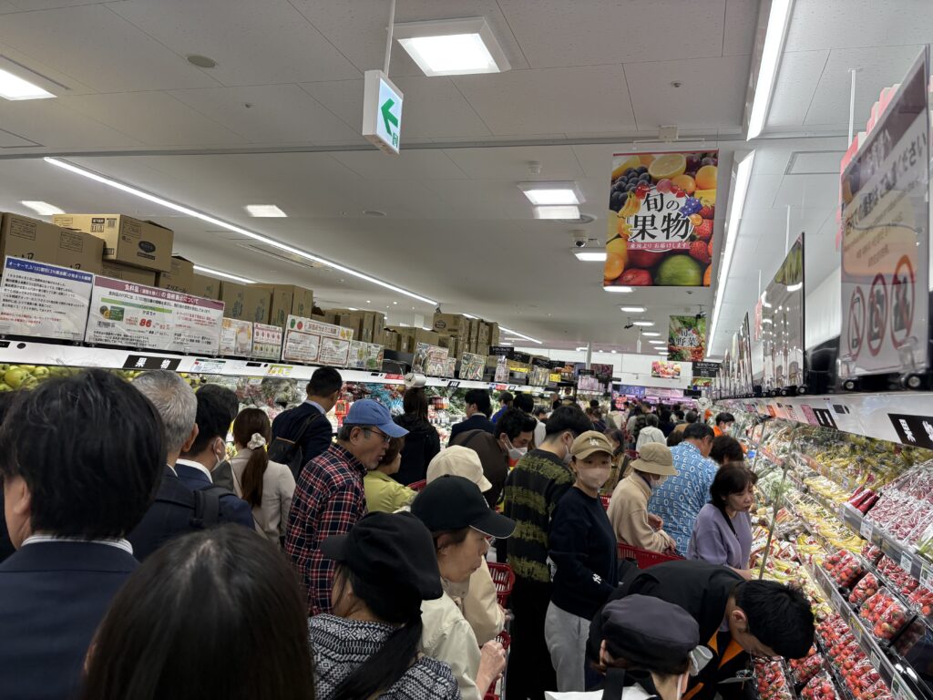 オープン初日、多くの買い物客がつめかけた=4月15日、オーケー南津守店(編集部撮影)