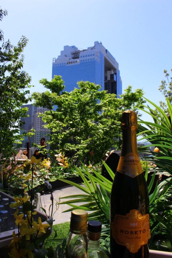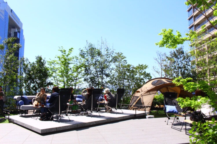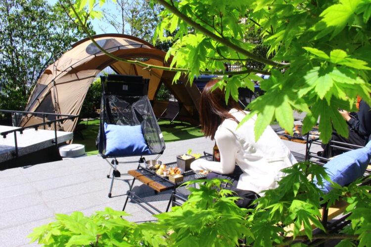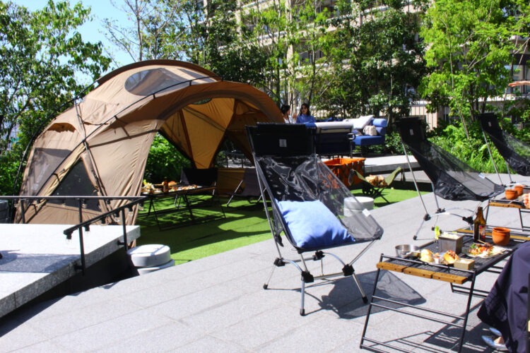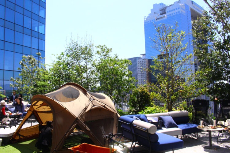 開発著しい「うめきた」に位置し、グラングリーン大阪の中心的存在の一つともいえるキャノピーbyヒルトン大阪梅田の11階で、高層ビルに囲まれた眺望と、目の前の緑の中に広がるキャンピング空間と言う異質なモノを組み合わせた「キャンパーノ・ビアガーデン」は、ほかでは味わえない時間と体験を提供する場所だ。
