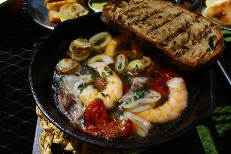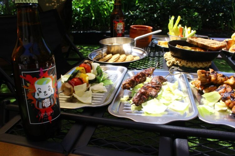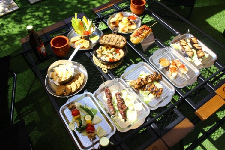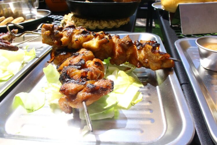 フードの中心は串焼き。豚バラ、チキン、野菜などがあり、それに加えてガーリックブレッドや海鮮アンチョビなどがメニューに並んでいる。