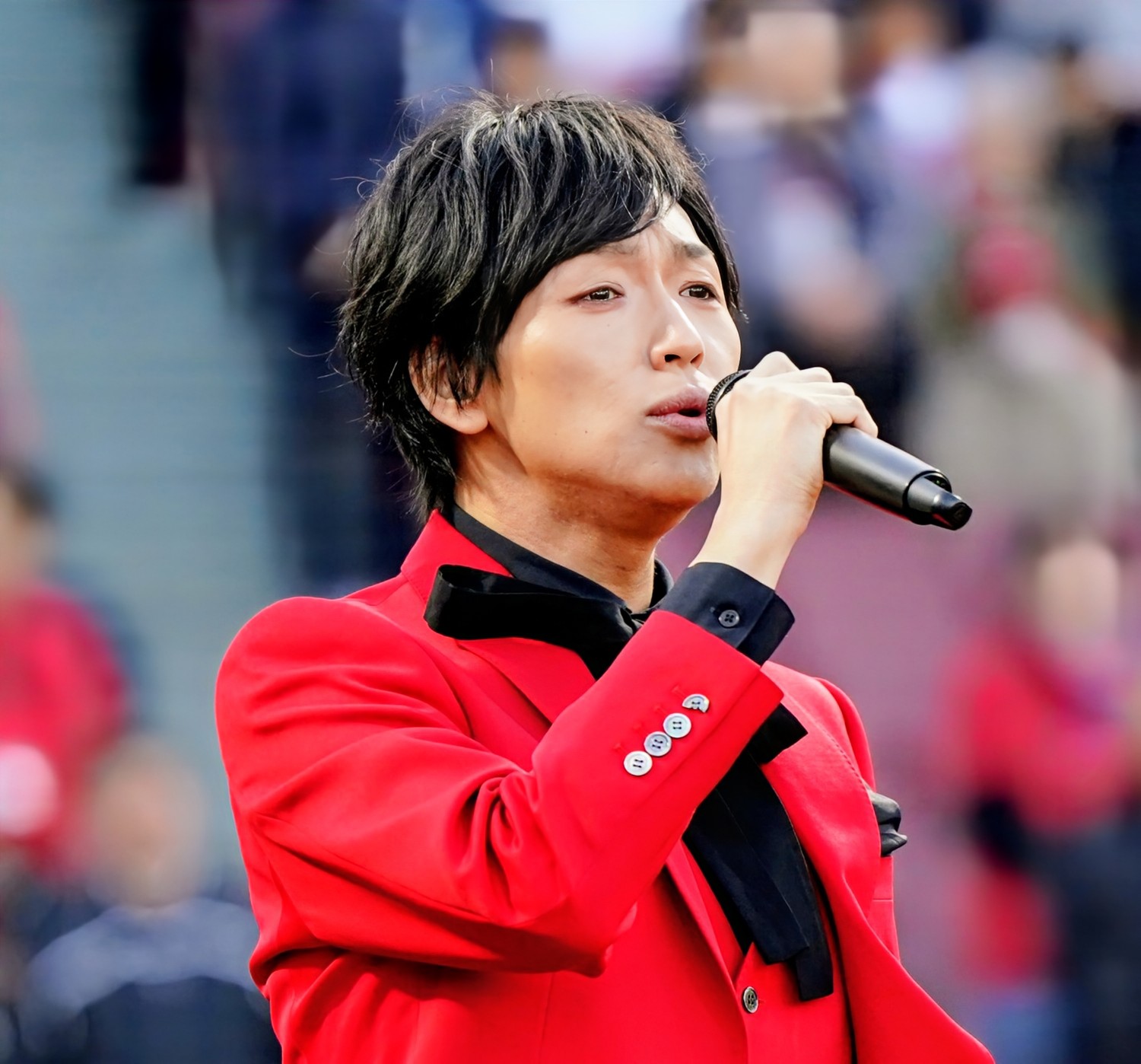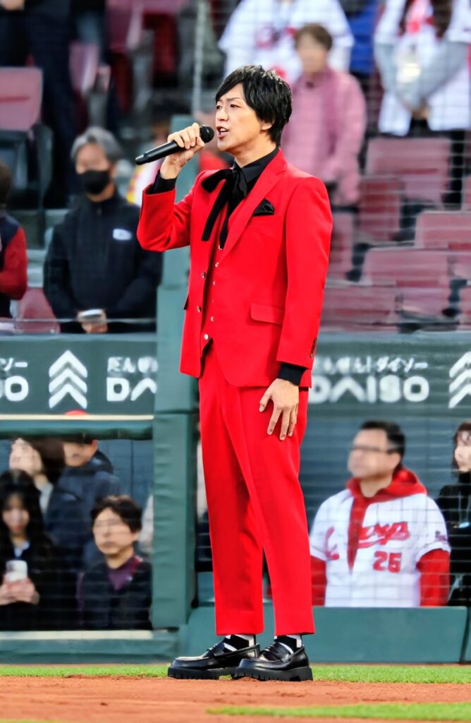 この日はカープカラーの赤色スーツ姿で登場。独唱では高低差があり難しい「君が代」を伸びやかな声で荘厳に歌い上げた。「幼い頃からスタンドで見慣れたカープの試合で国歌斉唱は夢のよう。めちゃくちゃ緊張しましたが、無事歌い終えられホッとしています。過去にこれほど多くの方々の前で歌わせていただくのは初めて。歌手として言葉にならない程の光栄で、ボクの生涯の宝物になりました」と感慨深げ。