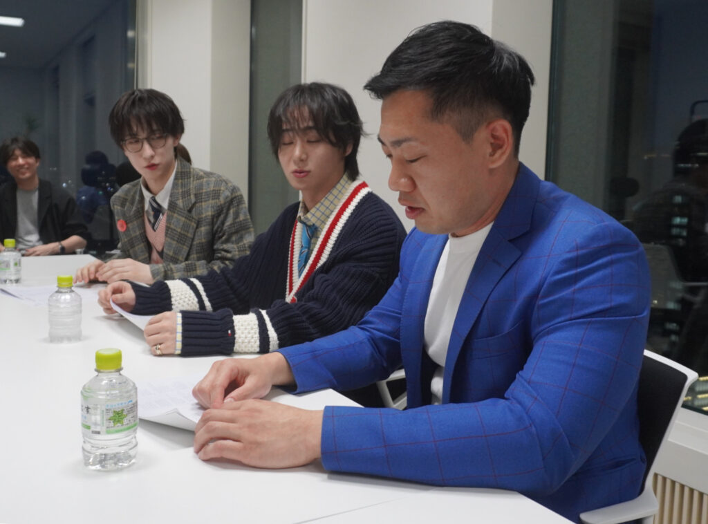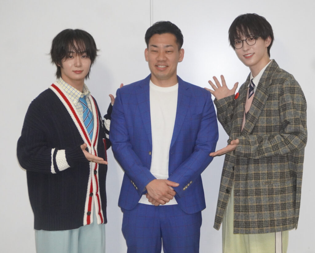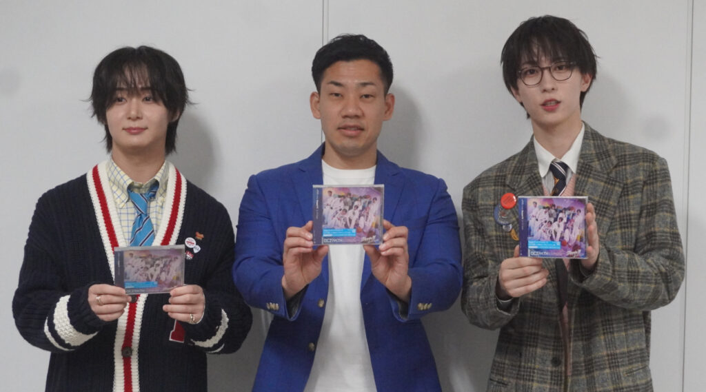 駒場は太田、四谷との対面がメンバーとの初顔合わせ。「最初は相方にも内緒でやっていたけど、普通の文章や漫才ネタを書くのとは全く違うので難しくて1週間ぐらい掛かった。漫才やったら全部説明せんとウケへんのですけど、歌は〝余白、残さなあかん!〟ので全く違う作業。出来上がった曲聴くと、OCTPATHさんが完璧に歌いこなしてくれていてうれしかった」とホッとした表情。今後は本業と二足のわらじを履くことになるが「いやいや、実体験からしか詞が書けへんので3作までが限度。印税生活? 絶対無理!」と苦笑。メンバーの2人は「ボクらもOCTPATHに入って5年目ですけど、それまでいろいろオーディションに落ちても諦めずに芸能界を目指した結果ここまで来れた。駒場さんの詞が心に響きました」と感想。