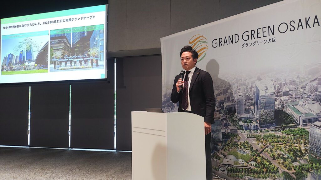 「グラングリーン大阪」の開発概要を説明する担当者。「うめきたの森」の整備や高架歩道橋による回遊動線の構築など、今後の展開が示された(23日、大阪市北区)