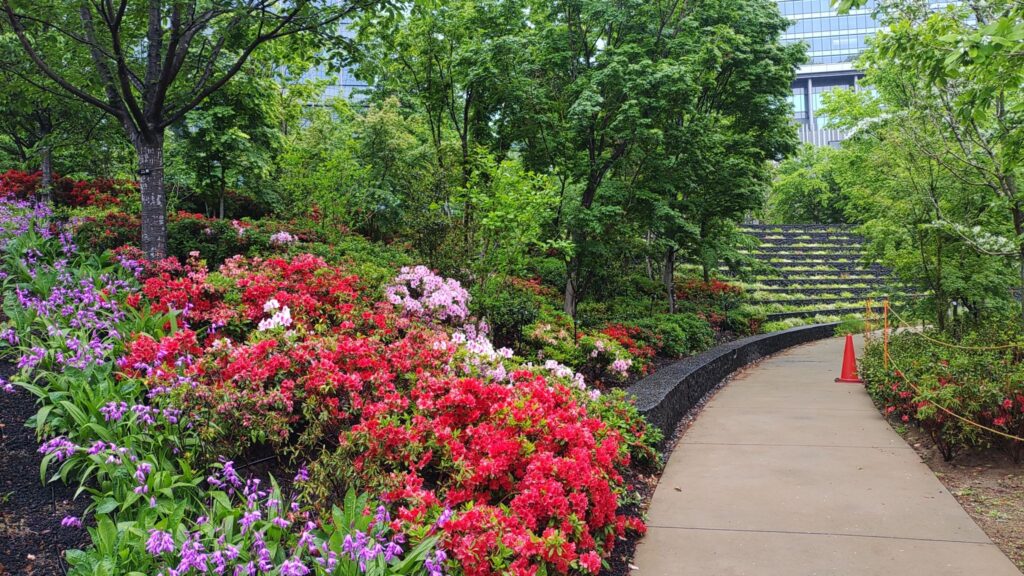 取材日は雨だったが、多数のツツジが赤い花を咲かせ、背景に近代的な高層ビルが立ち並ぶ中に紅一点のように咲き誇っていたのは印象的。