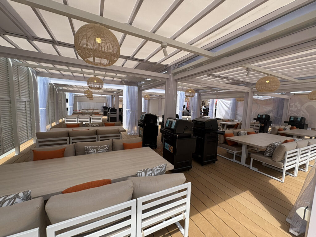 500席以上の大規模空間が特徴で、ソファ席も配置。屋上ならではの開放感の中でBBQを楽しめる。