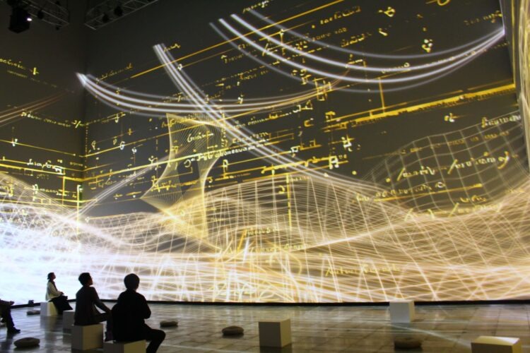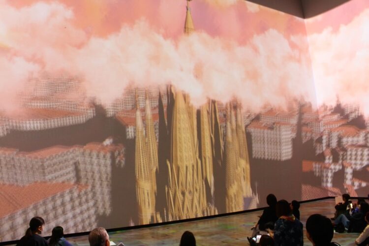 最後のエリアでは、参加型アートとして、プロジェクションマッピングを利用してガウディ建築の魅力に触れられる。映像ではサグラダ・ファミリアの起案からこれまでの歴史を時代を追って見ていく。また室内全面を使ってのダイナミックな映像展開はNAKEDがこれまで養ってきた経験を最大限活用した作品に仕上がっている。