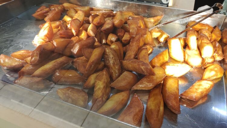 「芋菓子匠嶋屋」は、親子3代続く阿倍野の芋屋。初代が焼き芋屋を始めたところからスタートし、世の中が変わっても業態を変えることなく、商売人の工夫で生き残ってきたという。サツマイモを使った大学イモ「阿倍野ポテト」が主力商品で過去から変わらない味を守っている。