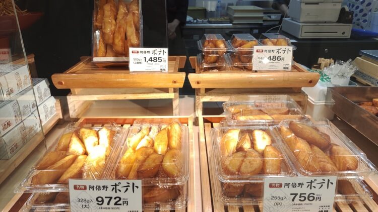 「阿倍野ポテト」は小腹が空いた時やがっつり食べたいとき、土産用など用途によってサイズの違うパックを用意しているが、その重さが164、255、328、500グラムと、キリの悪い数字になっている。その理由はパックの販売価格を500、700、900円と先に設定し、それに見合う量を計算したらこの数字になったとのこと。この裏には、昔、阿倍野エリアには団子屋や焼き芋屋などがたくさんいたため、団子一本と阿倍野ポテト1本の値段を比べられないようにするため、1本単位では計算しにくいようにしたそうだ。