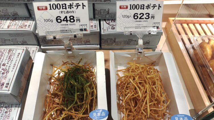 また催事では販売していたが、店舗での販売は初めて、というのが「100日ポテト」。閑散期の100日だけ販売していたからこの名前になったそうだが、人気になったので今では1年を通して販売している人気商品。開店から10日間だけは青のりをかけた特別バージョンを販売する。