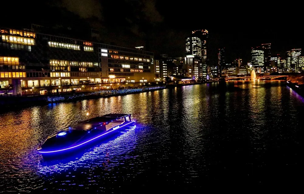 同船は全長21.38㍍、幅5㍍、最大定員70名で、小型船舶(20トン未満)では国内最大級。高級車メーカーBMWのEV車に搭載されているドイツ「トルキード社」製の高電圧リチウムイオンバッテリーを搭載。最新の電気推進システムにより走行時の振動がなく、川面を滑るように走るのが特長だ。川を渡る心地よい風を感じながら、水面に揺れるビルの夜景で昼間の暑さを忘れ、贅沢な時間を過ごす2時間乗り合いプランや、食事などの持込み可能な貸し切りプランなどさまざまなクルーズが楽しめる。